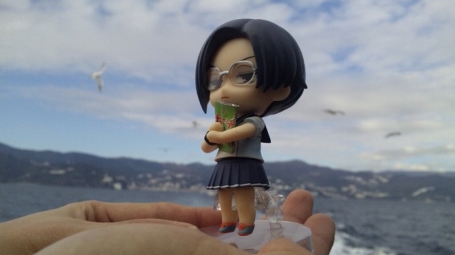 後ろからくるカモメ達から、ポテチを守るミドリンコです。